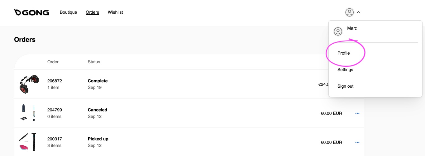 Dans votre compte, allez dans Profil. La page affiche votre nom, date de naissance, adresse e‑mail et vos adresses enregistrées.
