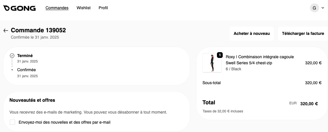 Une fois votre commande expédiée, vous pouvez récupérer votre facture directement sur votre compte GONG.